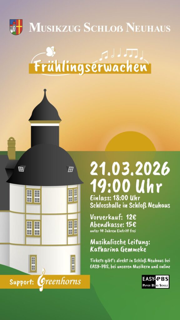 Der Winter ist bald vorbei, der Frühling steht bereits in den Startlöchern, genauso wie unsere Musikerinnen und Musiker. Wir freuen uns, Ihnen am 21. März 2026 um 19 Uhr unser Konzert, unter dem Motto Frühlingserwachen, in unserer Schlosshalle in Schloß Neuhaus zu präsentieren. Freuen Sie sich auf einen klangvollen Abend und lassen Sie sich von virtuosen Klängen und emotionalen Melodien verzaubern. Der Einlass erfolg ab 18 Uhr, für Speiß und Trank ist gesorgt. Karten gibt es ab sofort bei Easy PBS (Bielefelder Str.5), bei unseren Musikern und in unserem Onlineshop